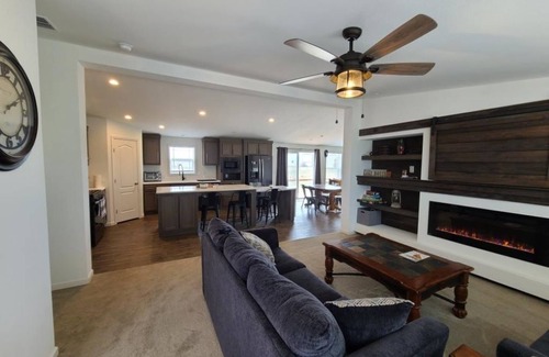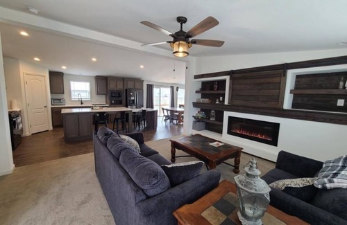 On each side of the kitchen you will find rooms for lounging. To the front of the house is a TV room with couches and an electric fireplace. If you need a nap on the couch, close the beautiful barn door to cover the TV.