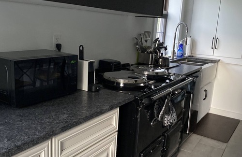 Kitchen: Complete kitchen with two small refrigerators, a British AGA stove, toaster, Keurig coffee machine + pods. Dinnerware and silverware are provided.