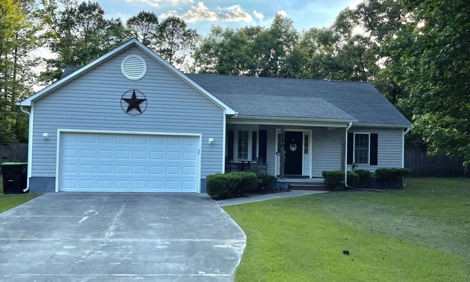 Beautiful home on the outskirts of town, minutes away from the airport! The back yard of this home is spacious and great for grilling with outdoors seating & plenty of space for kids to run around and play while the whole family enjoys the NC weather with some shade from the trees.