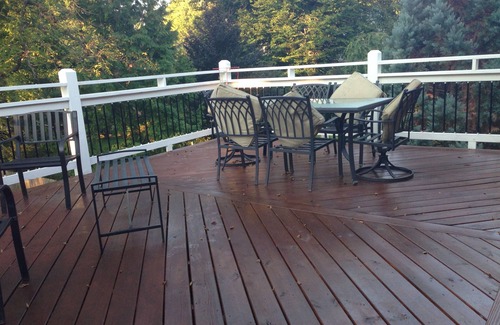 Our home has been completely restored and boasts an impressive 2400 sq. ft. of living space with 2.5 baths, 4 bedrooms, large kitchen with island, internet, master suite with jacuzzi tub, wood burning stove, 2 level deck with screened in porch, grill, large fenced in back yard that is secluded.