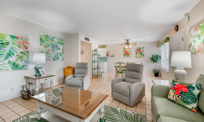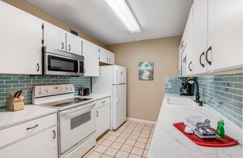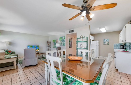 Welcome to unit #102, newly updated in 2023! Including a new sleeper sofa and lounge chairs in the living area. Beautiful counter tops, back splash, and faucet in the kitchen area. Bathroom now has a new cabinet and a lovely back splash! The Surfside complex is directly across the street from the beach and Gulf of Mexico. After a long day of fun in the sun you will love coming back to the beautiful courtyard with grills, picnic tables, covered sitting areas and a sparkling pool. The pool is heated as well so it can be enjoyed any time of year! The Surfside complex is made up of 2-bedroom condos surrounding the courtyard, making it the ideal choice for large groups looking to stay close to one another.