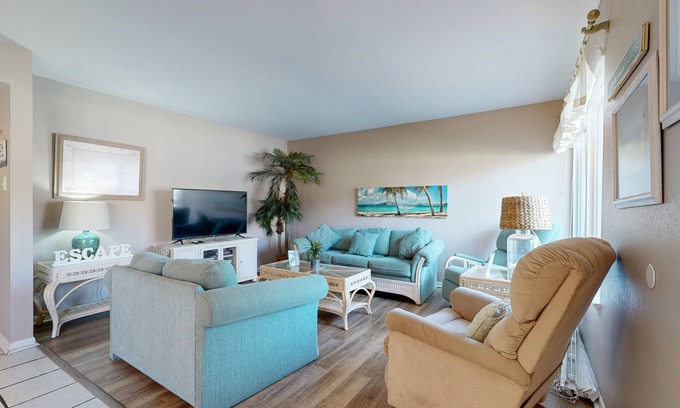 Welcome to unit #103, A beautiful unit with an open living area, with a sofa and a lounge chair in the living area. A fully equipped kitchen, with all-white appliances and a drip coffee maker. The Surfside complex is directly across the street from the beach and the Gulf of Mexico. After a long day of fun in the sun you will love coming back to the beautiful courtyard with grills, picnic tables, covered sitting areas, and a sparkling pool. The pool is heated as well so it can be enjoyed any time of year! The Surfside complex is made up of 2-bedroom condos surrounding the courtyard, making it the ideal choice for large groups looking to stay close to one another.