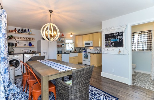 Spacious and beautiful new kitchen features large table to gather friends and family around. It is fully appointed to prepare and serve meals. High efficiency washer and dryer available for your convenience.