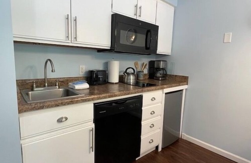 This condo sleeps 4: 1 Queen size bed in the bedroom and 1 Queen size sofa bed in the living room. There are 2 flat screen TV's and a full bath with the sink and mirror separate. The kitchen offers a microwave, refrigerator, dishwasher and a stove.