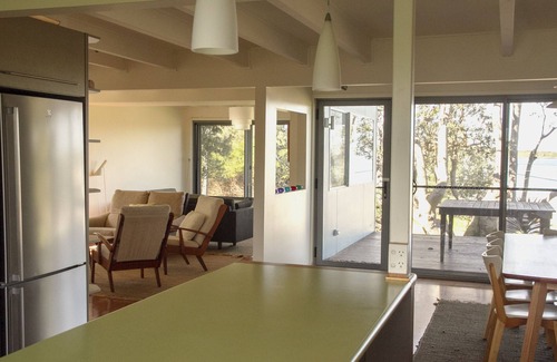 Bordering Murramarang National Park and located on Murramarang Beach, this house is the epitomy of the laid back lifestyle. It boasts a number of different zones, both interior and exterior. There are two living areas, two sleeping wings, two bathrooms and a large new kitchen and dining area. The front deck is oriented to the beach and the back deck offers a delightful bush feel with mature trees and native plantings.