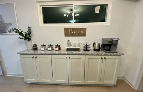 •Kitchen with Keurig machine, coffee pods, creamer, and sugar, and tea