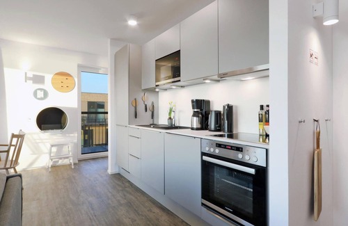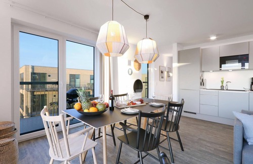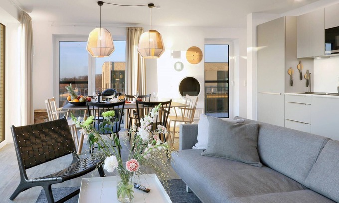 Welcome to your exclusive penthouse, where you can look forward to a wonderful stay in every respect. You will be welcomed by high-quality furnishings, a cosy ambience and Scandinavian design furnishings - a place perfect for an upscale getaway. Thanks to the bio-fireplace, you will find a cosy warmth even on cold days, while the floor-to-ceiling windows flood the apartment with light and make it particularly livable. From the balcony, you and your friends or family can let your gaze wander over the countryside.