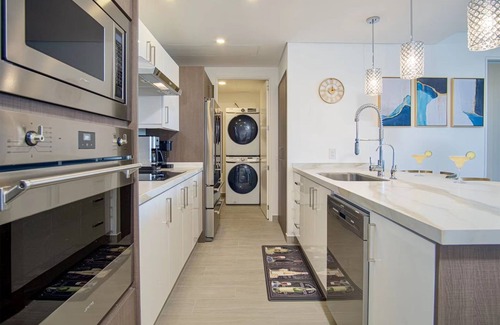 A full modern kitchen and a washer and dryer for your convenience.