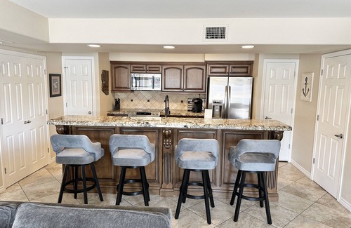 There are only a few of these beach level units! They have larger kitchens than the upper units and have two master suites complete with large vanities with double sinks, ample storage, and sliders that lead to the covered furnished patios with ceiling fans.