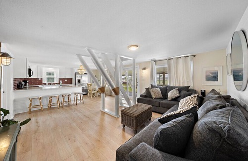 Blue Sky Bungalow offers a bright and airy open floor plan on the main level, perfect for families or groups. The living area features a large flat-screen TV for movie nights, while the dining table and kitchen island provide ample space for meals and socializing. Three bedrooms are conveniently located on this level: one with a king-size bed, another with a queen-size bed, and a third with two sets of full-size bunk beds, ideal for kids or extra guests.