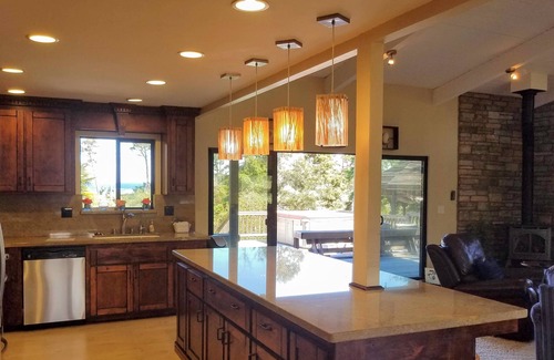 Beach Haven is the perfect park-like retreat for being as relaxed or adventurous as you feel. The light and bright open concept living area include a modern kitchen with stainless steel appliances, granite counters, and an eat-in island. The large dining table is the perfect place to enjoy a memorable meal with loved ones. Choose from many comfortable seating options throughout the room to relax and enjoy the ocean, lake, and pond views.