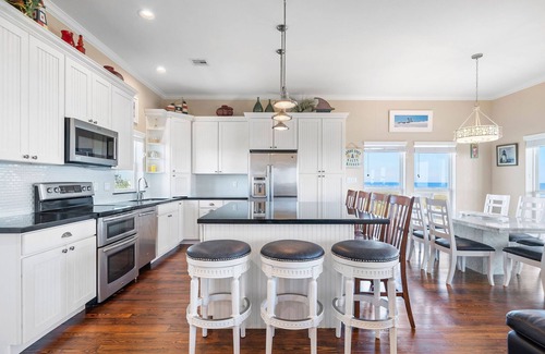 Inside, the open-concept main level features a fully equipped kitchen, cozy living area, and dining table with bench seating—all framed by stunning beach views. A powder room adds convenience, and a main-level king suite with deck access offers a peaceful retreat. An elevator makes moving between floors a breeze. Upstairs, the spacious primary suite includes a king bed, private bath, and a balcony with seating and ocean views. Two additional bedrooms—one with two queen beds and another with two pyramid bunks plus trundles—offer flexible sleeping arrangements for families or groups.