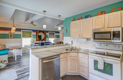 This beach cottage is the perfect vacation home! Just a half block to beach access and boating (canal) access with view of both from the deck. The picture of beach access is taken from the house. One bedroom offers a full bed and the other offers 2 full/twin bunks. The living room features a futon sofa as well.