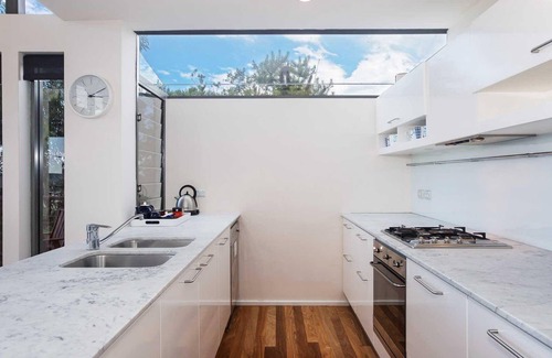 The beach house is set high on the hill overlooking One Mile and Samurai Beaches. The air conditioned lounge, dining room and kitchen are enclosed by full length glass offering you panoramic ocean and bush views. Sit back, relax and unwind; let the tranquillity work its magic or cook up a storm or a BBQ then sit back and enjoy the fruits of your labour whilst taking in the view. If the ocean is not enough then the birds and wildflowers provide their own magic.