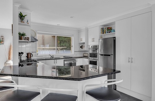 The kitchen is fully equipped with utensils and appliances, as well as pots, pans etc to make cooking with your family a pleasure. There is ample bench space with bar stools for relaxed breakfasts after a morning swim.