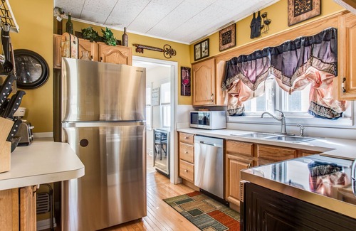 Main level has great room with gas fireplace, big screen TV, kitchen plus open concept living/dinning area, a main floor master bedroom (queen bed) and a main floor full bath. Main level deck, outdoor seating and gas grill.
