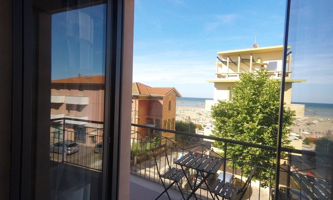 Wide 3 bedrooms apartment with sofa beds in the living room, completely refurbished and equipped with all sorts of comfort (air conditioning, dishwasher, washing machine, Wi-Fi), breath-taking view over Viserba's beach and located in the center of Viserba, 4 kms away from Rimini central, and fairly close to Rimini Fiera fairground, excellent for staying among friends, a numerous family or a business trip on the Riviera.