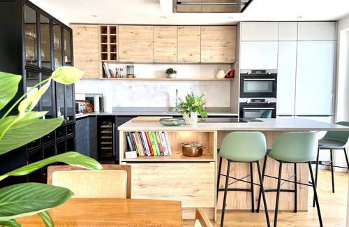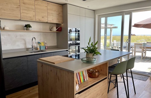 • Kitchen: (NEW 2021) open plan kitchen looking out onto the beach deck with island/breakfast bar including induction hob and extractor fan on the island, tall fridge/freezer, dishwasher and 8kg washing machine, oven, microwave/combi oven and warming drawer, wine cooler, Quooker boiling water tap.