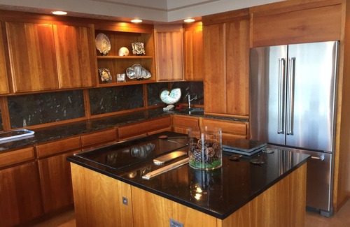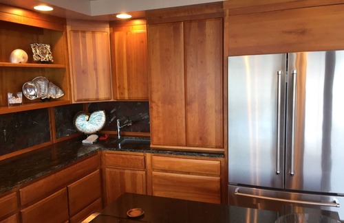 GROUND FLOOR: A large luxury kitchen awaits! Custom maple cabinets, black quartz counters, custom imported stone backsplash, stainless KitchenAid appliances, warmer drawer, downdraft ventilation, and plenty of sea-themed dishes to host your extravagant party. Adjacent to the kitchen is a large glass kitchen table comfortably seats 8-10 to host your magnificent meals. A large living room with vaulted ceilings, exquisitely finished open glu-lam beams welcomes you with comfortable leather furniture and a high-efficiency wood-burning Fireplace Extraordinaire set in black quartz. There is also a Sonos sound system (requires Sonos app that you can download for free online) for your listening pleasure. Down the hallway you will find a custom tile bathroom with glass vessel sink and shower. Just past the bathroom there is a guest room with a comfortable Sealy Posturpedic queen bed and large double closet and LED TV. Walking through the spacious laundry room leads you to the TV room with 55” flat screen, DVD/Blueray, 5.1 surround sound, Microsoft Xbox, select movies, X-box games and board games. You can also watch movies on Amazon and Netflix. Just past the TV room is the “back cabin” that is a self-contained studio unit (queen hide-a-bed, fully-equipped kitchen, bathroom with shower, and loft with extra sleeping accommodations with twin mattresses -- ideal for kids).