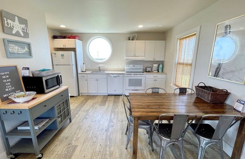 We Welcome you to Beach Nut Bungalow. This two bedroom Ocracoke Island home is located in Pamlico Point. This popular neighborhood is close to Ocracoke's beautiful beaches, popular restaurants and the local grocery store. This reverse living home features a second floor open floor plan including a living area, dining and kitchen. Enjoy this home’s high ceilings and comfortable deck off the living area and first floor screened porch. 1 Bedroom with Queen Bed. A second bedroom offers a Bunk Bed and a Twin Bed. 1 Bath with tub/shower. Amenities include central air conditioning/heat, ceiling fans, TV, DVD and complimentary wireless internet access. Washer and dryer. *This home does not provide linens. The exterior offers a screened porch, deck, outdoor hot/cold shower, charcoal grill, fish cleaning table and covered parking. No Smoking. No Pets Allowed. Limit of 2 vehicles. Military Discount Available. Discount can only be applied at time of booking. Short Stays are available; there is a three-night minimum, and these stays can be booked within two weeks of arrival. Location and Property Layout: Pamlico Point is the newest neighborhood in Ocracoke Village. Travel mapping websites, including Google Maps (which is also found on our Location Tab) does not show all current homes or those under construction. If you have any questions about Pamlico Point please do not hesitate to contact our office. First Floor: Bedroom with Queen Bed with Screened Porch accessible via bedroom and external staircase. Bedroom with a Bunk Bed and a Twin Bed. Hallway Bath with tub/shower, entry via hallway and Queen Bedroom. Second Floor: Open Kitchen, Dining and Living Area with TV/DVD and open deck. Pantry. Laundry closet with stackable washer/dryer.