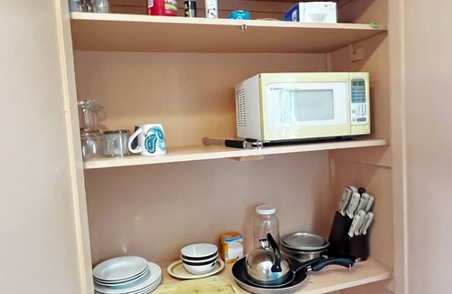 The kitchen comes fully stocked, allowing you to prepare all your meals on electric burners/hot plates with pots, pans, knives, utensils, and a coffee maker provided for your convenience.