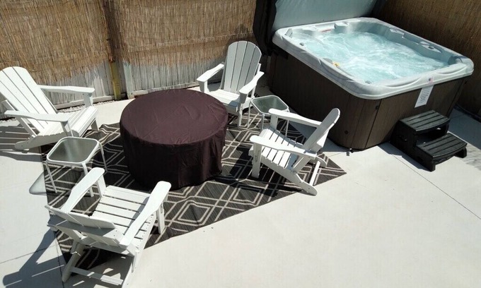 ☀ Private Backyard Patio with Outdoor Seating, Hot Tub, and Fire Pit