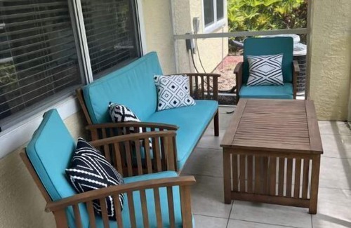 Cute beachy condo 20 min from the beach. 2 bed, 2 bath 1st floor unit. Updated and super fun. Beautiful tropical feel community with ponds, two pools, hot tub, clubhouse, fitness center, tennis courts, grills, car wash station & library. Carport parking. Great location. Close to many stores and restaurants.
