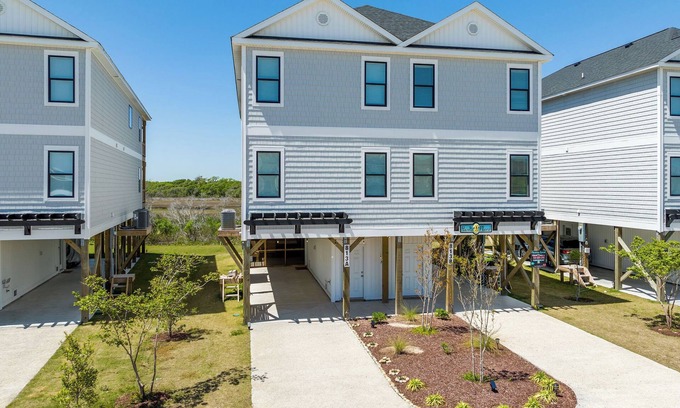 This beautiful new construction is located perfectly in Surf City NC, within walking distance to shops, restaurants, parks, the bridge and so much more. Luxury is definitely the key word for this amazing house, high-end appliances, furniture, linens, towels, toiletries, paper products, and so much more. The house leaves you wanting for nothing but more time. Amazing outside lounge area with outside shower, and a beautiful sound view.