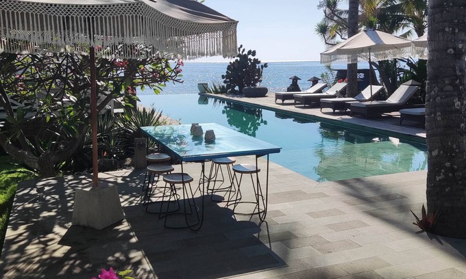 Stunning villa in a lush garden directly on the beach, boasting an 18-meter infinity pool, open-plan living areas, and 3 independent, air-conditioned bedrooms. The 30m² master suite features an open-air bathroom. Two additional 20m² bedrooms, including one with an open-air bathroom, are located in a separate pavilion.