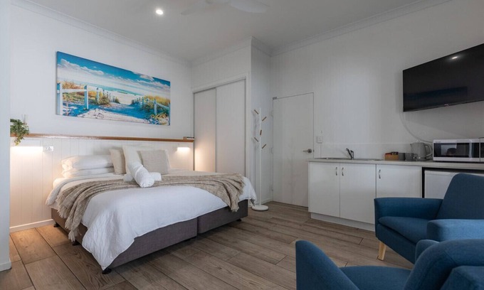 This unit is equipped with a king-sized bed, smart television, free wi-fi, toaster, kettle, bar fridge, microwave, air conditioning and a walk-in shower (no tub). There is a car parking space available onsite.