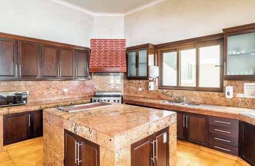 The spacious gourmet kitchen at Hacienda Caracol is designed for both functionality and style. Featuring rich wood cabinetry, granite countertops, and high-end appliances, this kitchen is fully equipped to handle everything from casual breakfasts to gourmet meals. Guests will enjoy private chef service, included daily from 8 AM to 6:30 PM, ensuring every meal is expertly prepared to their tastes. A large central island provides ample prep space, while a breakfast bar with seating is perfect for a quick bite or a morning coffee.