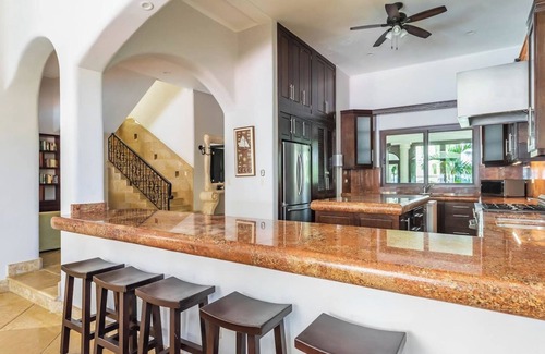 The villa’s fully equipped kitchen is a chef’s dream, featuring granite countertops, high-end appliances, and a spacious island for easy meal preparation.