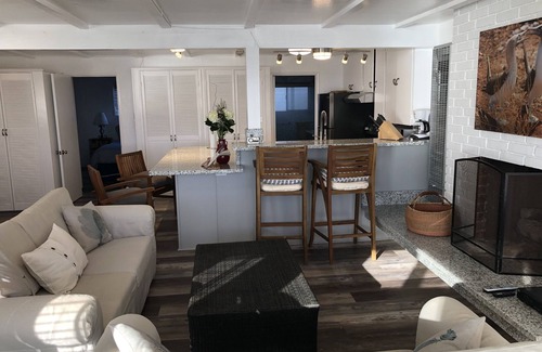 King-size bed in bedroom, additional queen-size bed in ocean alcove. Living area has TV, DVD, high speed internet and decorative fireplace. Garage accommodates one car inside and one out. Full bath, kitchen and beach shower. Linens, towels, beach chairs, beach towels and umbrellas. Limited to four persons.