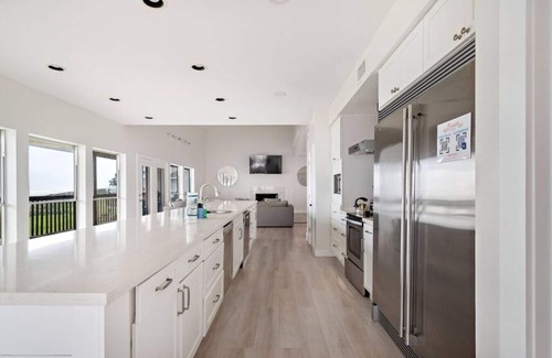 The stylish kitchen features a huge quartz-topped island— 30 feet long! White cabinets, two dishwashers, and a commercial-grade refrigerator face the ocean views, while additional glass-front cabinets and workspaces are around the corner. There is ample seating between the seats at the island and the nearby dining table. Your whole family will love to gather together in this bright space over warm mugs of coffee in the mornings or cocktails at happy hour. A door off the kitchen leads into a convenient laundry room and pantry.