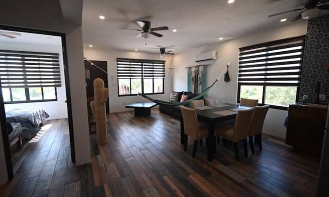 This home boasts two well equipped kitchens, comfortable furnishings and breathtaking rooftop views of the ocean. With the proximity of 50 meters to the beach you are just steps away from enjoying the sand between your toes on Celestun's pristine sandy beach. The house is located minutes away by car from town center.