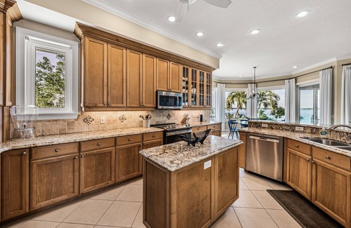 Master suite on the top floor has a king bed with panoramic views of the water and built-in desk space for remote working if you have to clock-in for a few hours. This suite also has a large bathroom that includes Jack & Jill sinks with large walk-in shower and a jetted Jacuzzi tub. Other bedrooms include a king, two queens and a pair of double beds for the kids.