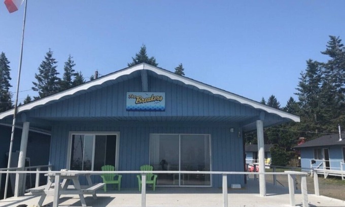 This cabin is located directly on the beach with unobstructed ocean and mountain views. It is an updated cabin with a rock fireplace and live edge mantle, taste fully decorated with a beach theme. It is open concept, bright and airy. The kitchen has lots of storage and fully stocked, there is a dining table, stainless appliances including a dishwasher. There is a full bathroom with tub and shower. The master bedroom boasts an ocean and mountain view from the queen size bed made up with cozy bedding. This room has a dresser and hanging closet with a barn door to unpack for a longer stay if desired. The second bedroom has a bunk with a double on the bottom and a single on top along with another single bed. The living area has a comfortable couch and chairs with an ocean view set in front of the fireplace. Outside the sliding glass door is your large covered sundeck with a picnic table and deck chairs, just off the deck is a private fire pit located on the beach. 3-night minimum stay on long weekends.