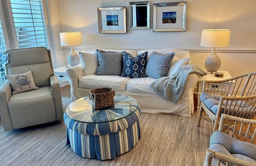 Beachfront master with ensuite and two twin guest room with separate full bath, featuring hardwood and tile flooring, crown moldings, plantation shutters, upgraded appliance One car garage. Theater TV, entertaining amenities and remote workspace make this getaway feel like every day is a vacation day.