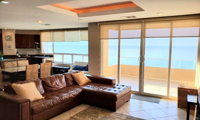 Amazing ocean views, private beach steps away. 3 beds, 2 baths, sleeps 8. Open concept kitchen and living area. Access to club house, two oceanfront pools, 4 jacuzzies, firepit, sauna, and private beach access. 24 hour security with a self check-in keypad. Wifi and Netflix included. Fully stocked with cooking utensils, Keurig, and essentials. Enjoy the sunsets right from the living room and your balcony. Minutes from downtown Rosarito. This is a perfect place to relax and enjoy local attractions. Wineries, Lobster Town Puerto Nuevo, Sand Dunes, Fishing, and endless local cuisines are minutes away. A 25 minute drive from San Diego border makes this a perfect getaway destination.