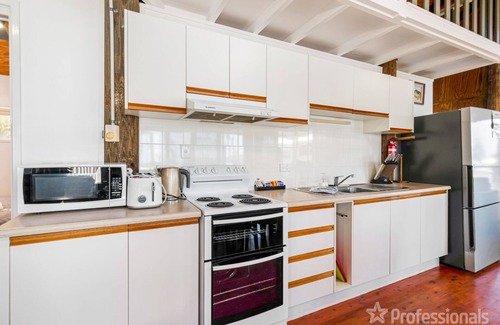 The Holiday House is beautiful open plan beach home with fantastic views over to the islands. The patio is large with outdoor settings for eating & entertaining or just relaxing with a lovely sea breeze. This home sleeps 4 ideally with 2 separate bedrooms. King bed in main room 2 single beds in the other. Generous sized living area & a bathroom with a separate bath/shower also toilet downstairs.