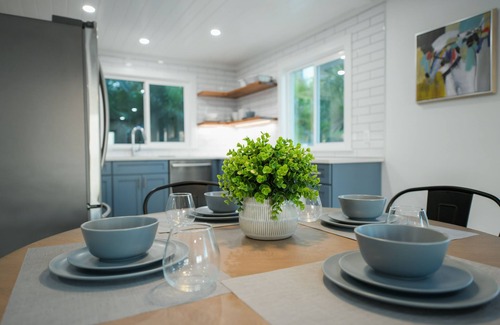 Inside, this inviting home features vibrant decor with a welcoming atmosphere. Lounge comfortably in the chic seating area, catch your favorite shows on the TV, or enjoy a meal at the stylish dining table set for four. The fully stocked kitchen boasts stainless steel appliances, a variety of pans and utensils, and ample space for preparing delicious meals that you can enjoy indoors or outside on the patio.