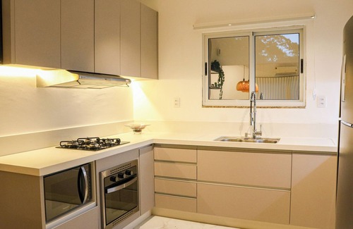 Complete kitchen, equipped with: • Refrigerator • Gas cooktop • Electric oven • Microwave • 2 Coffee machines (Nespresso and electric coffee maker) • Air fryer • Sandwich maker • Blender • Kitchen utensils (pots, pans, cutlery, plates, glasses, etc.)