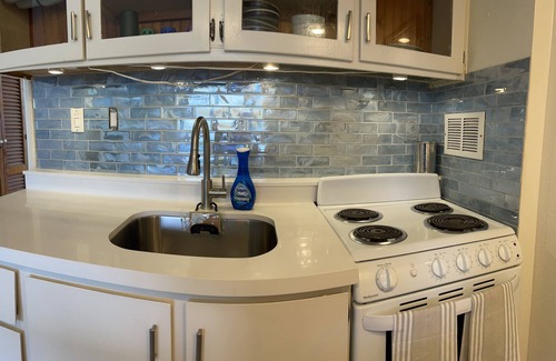 Our newly remodeled kitchen comes equipped with brand new backsplash, quartzite countertops and breakfast island, and brand new sink. For your convenience, it also includes flatware, complete dish set, pots and pans, toaster, k-cup coffee maker, microwave, refrigerator, oven, rice cooker, blender, cooking utensils, glasses, and much more.
