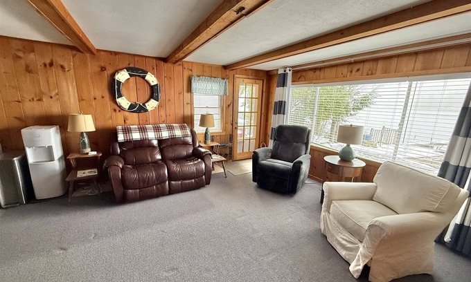 OCCUPANCY LIMIT 4 - BEACHFRONT on Little Sebago Lake with a dock. 2-bedroom 1 bath cabin with an open floor plan. The living room has a large window with great views of the lake. One bedroom has a king bed, the other bedroom has 2 twin beds. Window AC units in each room. Enjoy the outside with 2 docks and a fire pit. Only one dock can be used for boats. Water supply comes from the lake (Guest need to bring their own water) There is a water cooler for 5-gallon jugs.