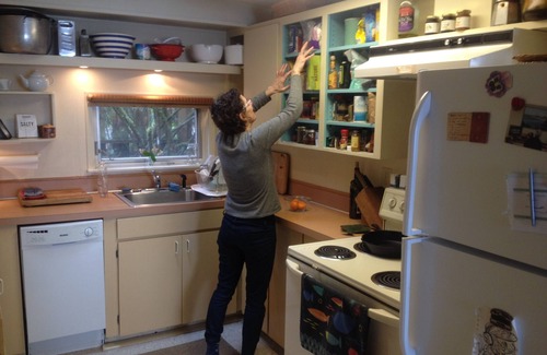 Kitchen is equipped: refrigerator, range, microwave, coffee maker, coffee bean grinder, wine & cocktail glasses, and gadgets; stocked with basics for cooking: spices, condiments, sugar, pots, pans, cookie sheets, etc. No frills but all you may need.