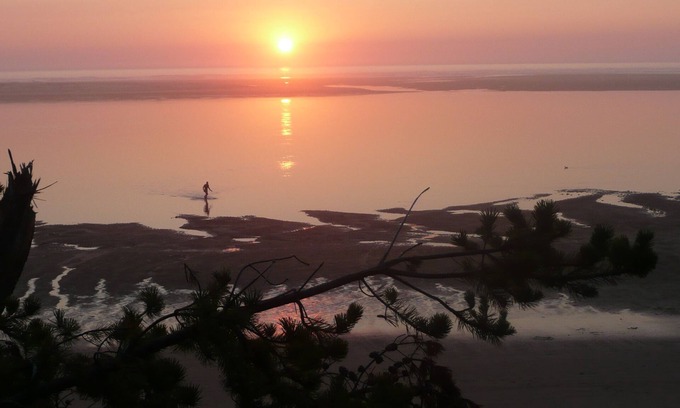 Old-time 1970s beach cabin with fireplace and 180 degree view of Netarts Bay, Pacific Ocean, Three Rocks Wildlife Refuge, Cape Lookout, and Netarts Spit.
