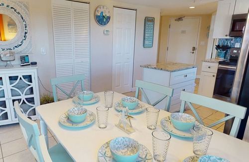 Stock up for the week at Publix, Dollar Tree, CVS, short half mile north of the resort! Cook your own delicious meals in the fully stocked kitchen with brand new stainless-steel appliances, pots and pans, beachy dishes, flatware, mixing bowls, and most everything else you need. Grill your favorite steaks, burgers, seafood, or veggies on the gas grills conveniently located by the pool and hot bubbling spa. Sit down for a family meal at the dining table with six chairs.