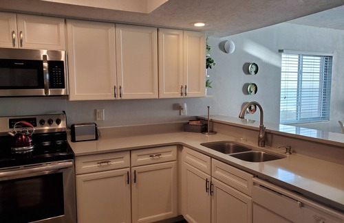 This unit sleeps 4 in beds. The maximum occupancy for this unit is 6 as we can provide an air mattress. Located in beautiful Indian Harbour Beach, Florida in central Brevard County, we offer guests a relaxing stay. All our units directly face the ocean and provide a beautiful ocean view! Each unit is a beautifully decorated 2 Bedroom/2 Bath condominium. This 1350 sf corner unit condo is in the Indian Harbour Beach Club on the second floor. This beach front condo complex is a hidden gem that most people do not know about. Those who do know about it, usually reserve their rooms a year in advance. There is covered and open parking. And on the inside, the master bath and guest bath are fully equipped with all the necessities. Linens and towels are provided. TVs are in the living room, master bedroom, and guest room. Content is supplied by Spectrum and complimentary movie channels are provided. The kitchen is fully stocked with everything you would expect. Refrigerator, dishwasher, microwave, stove, coffee pot, blender, toaster oven etc. The master bedroom has a king size bed, and the guest room has two single beds. The laundry room has a large capacity washer and dryer. The complex also has a heated swimming pool, shuffleboard courts, outdoor gas grills, and a car wash area. Beach chairs (2), beach towels and an umbrella are provided.