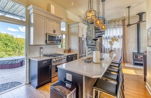 * LEVEL ONE: Kitchen, Living Room (pullout queen sofa, space for 1 Aerobeds), 1 full bathroom, Entry, and first level deck (hot tub, grill, dining), connection with Main House