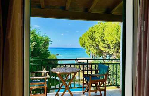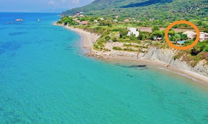Villa Rania is an exciting, sweet, beachfront property with 3 bedrooms and private swimming pool enjoying one of the most sensational locations of Corfu. Proudly standing right above the perfect and virtually private sandy bay of Kanouli, in South Corfu, Villa Rania is set to impress for its views, space, peace and indeed unique setting. With 3 bedrooms, 2 bathrooms, fully equipped kitchen and extensive outdoor areas, the villa can sleep up to 6 to 8 guests. Reach the sandy bay via directly from your pool patio, enjoy a delicious dinner while admiring the sunset, dive by the pool, chill out in the air-conditioned interiors, or read a book in the mature gardens: this will be a holiday to remember.
